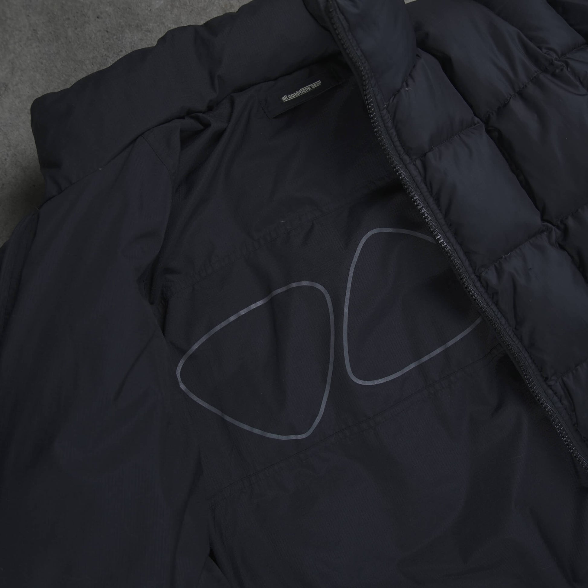 - Features: Reversible (2-sided wear), full front zip, high collar, elasticated cuffs/hem with drawcords, zip pockets, embroidered "all conditions gear" inner collar label, large back triangle graphic, sleeve logos, ACG patch details
