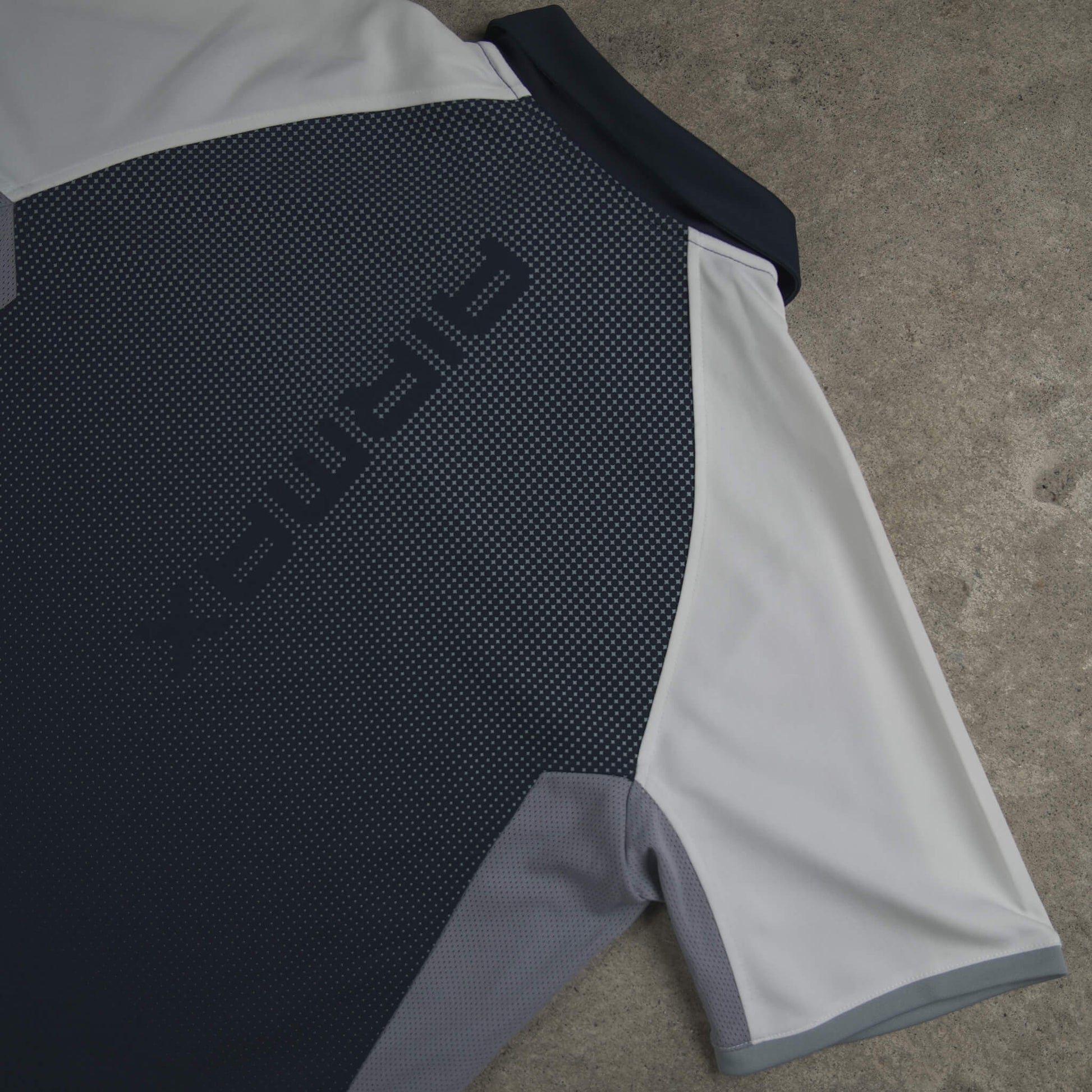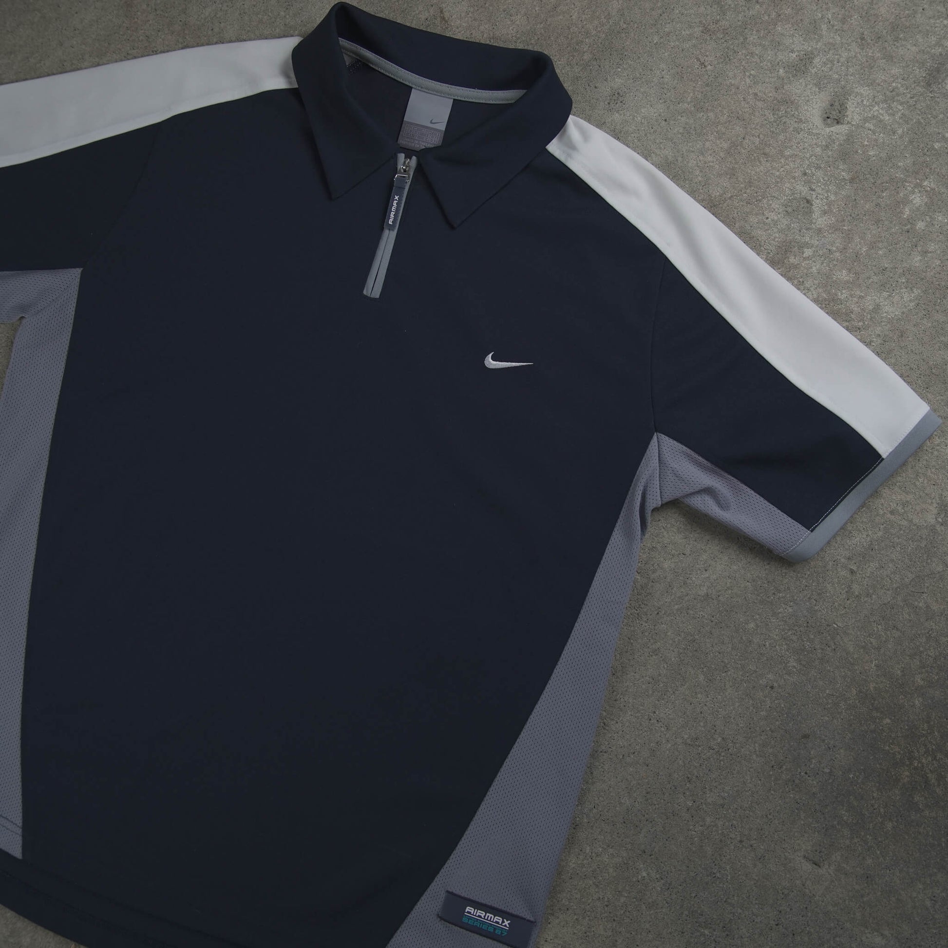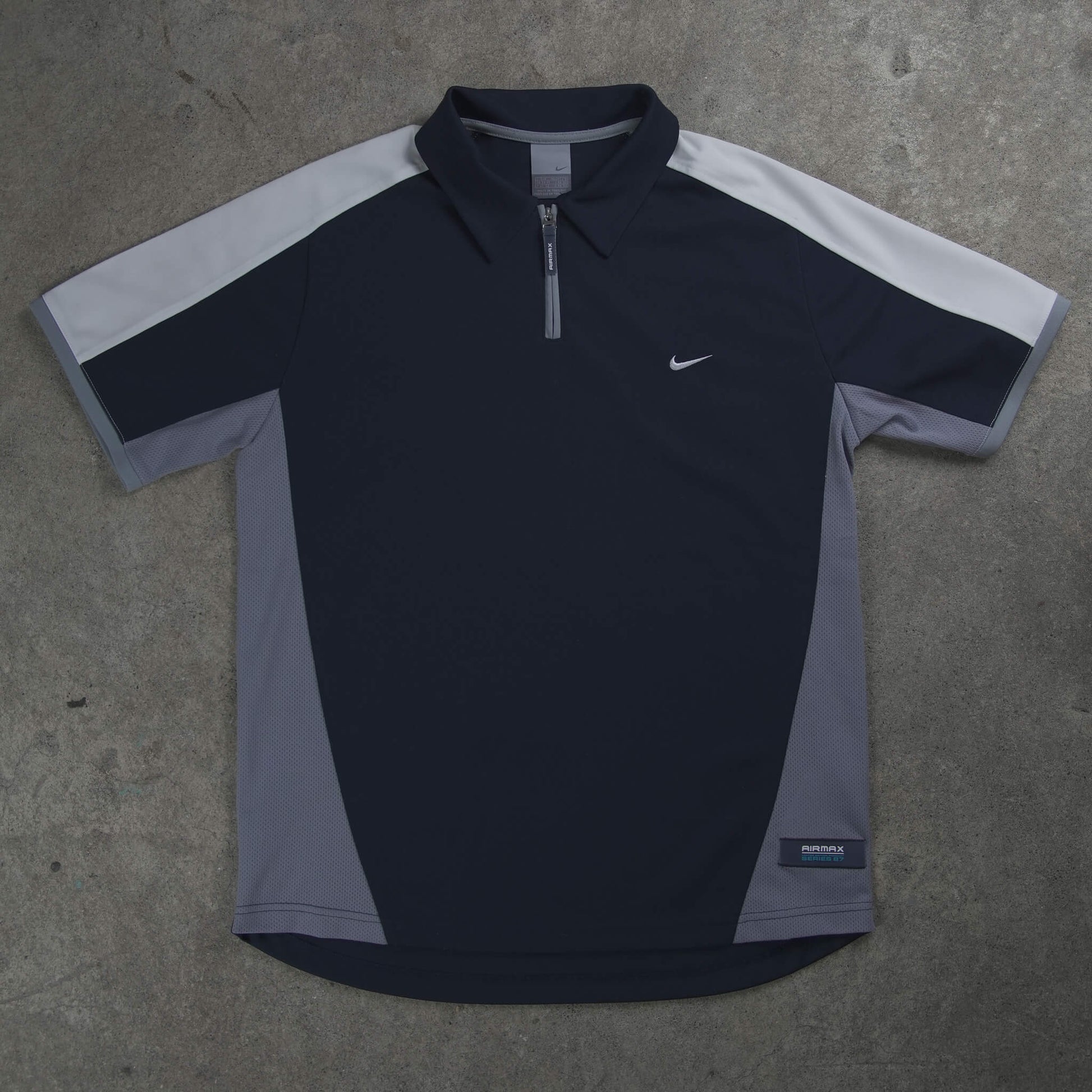 Authentic Vintage Nike Airmax "Series 87" Performance Polo Shirt (2005).Ultra-rare technical piece from Nike’s 2005 Airmax apparel collection. This polo is a deep dive into the "Series 87" line, paying homage to the year the original Air Max 1 was born. Featuring a sharp navy, grey, and white color-block design with a unique gradient dot-matrix print on the back, it perfectly captures the high-tech, futuristic aesthetic of the mid-2000s.