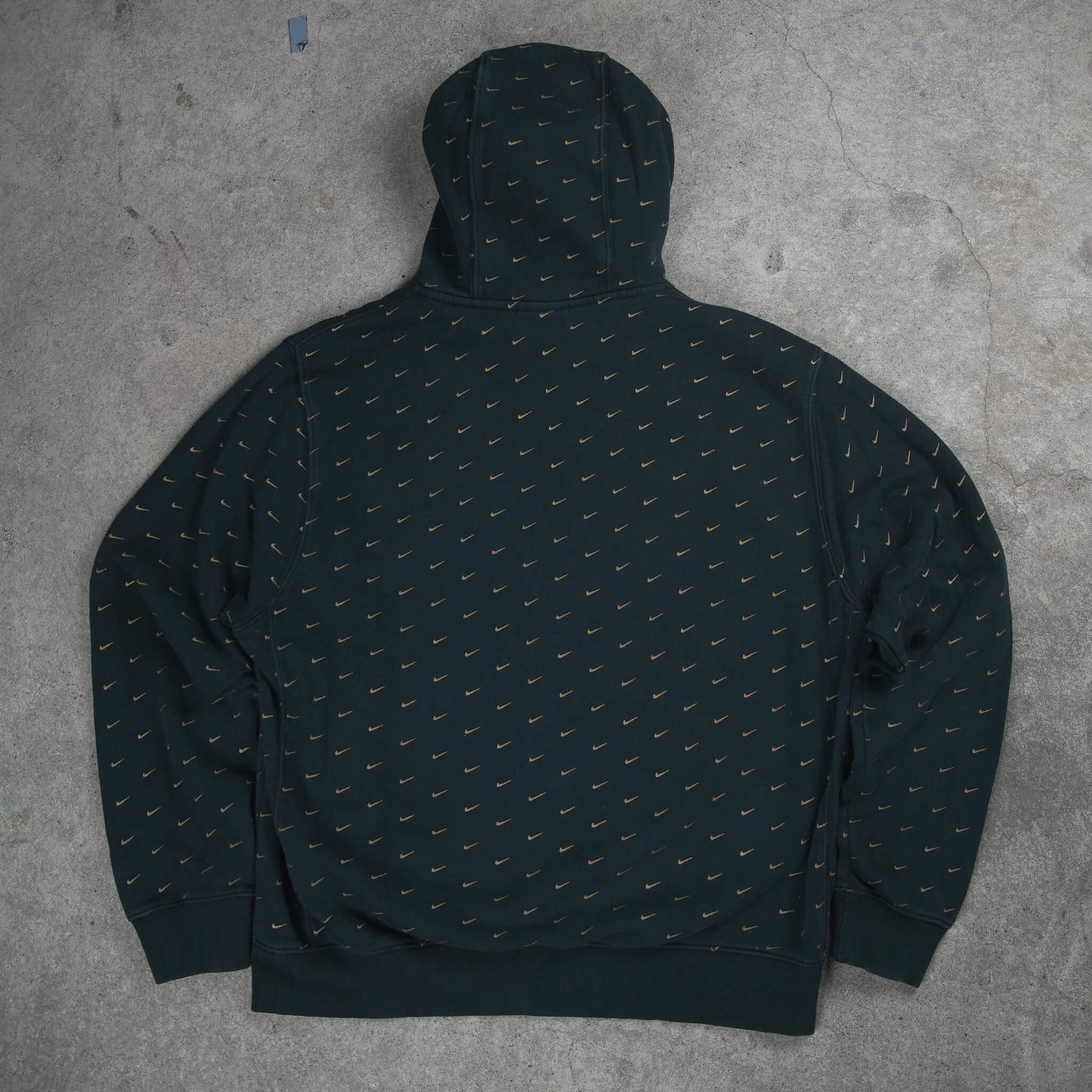 Black hoodie covered in an allover printed gold mini swoosh monogram. Embroidered Nike logo on the hood, kangaroo front pocket, ribbed cuffs and hem. Oversized relaxed fit - a rare and highly wearable piece in top condition, no holes or stains.