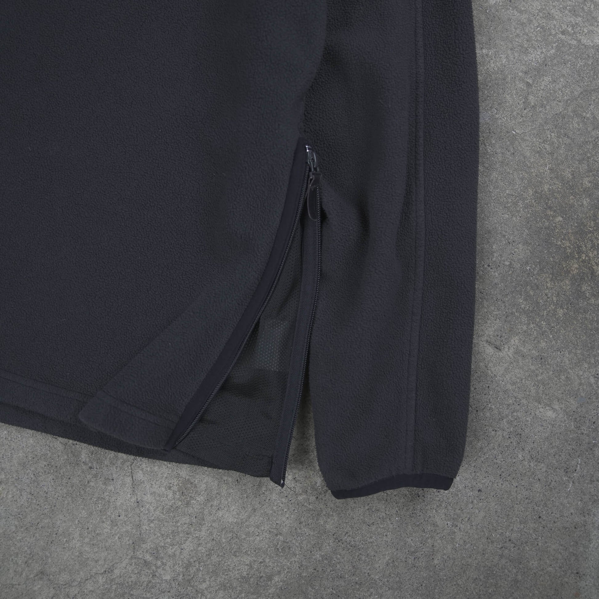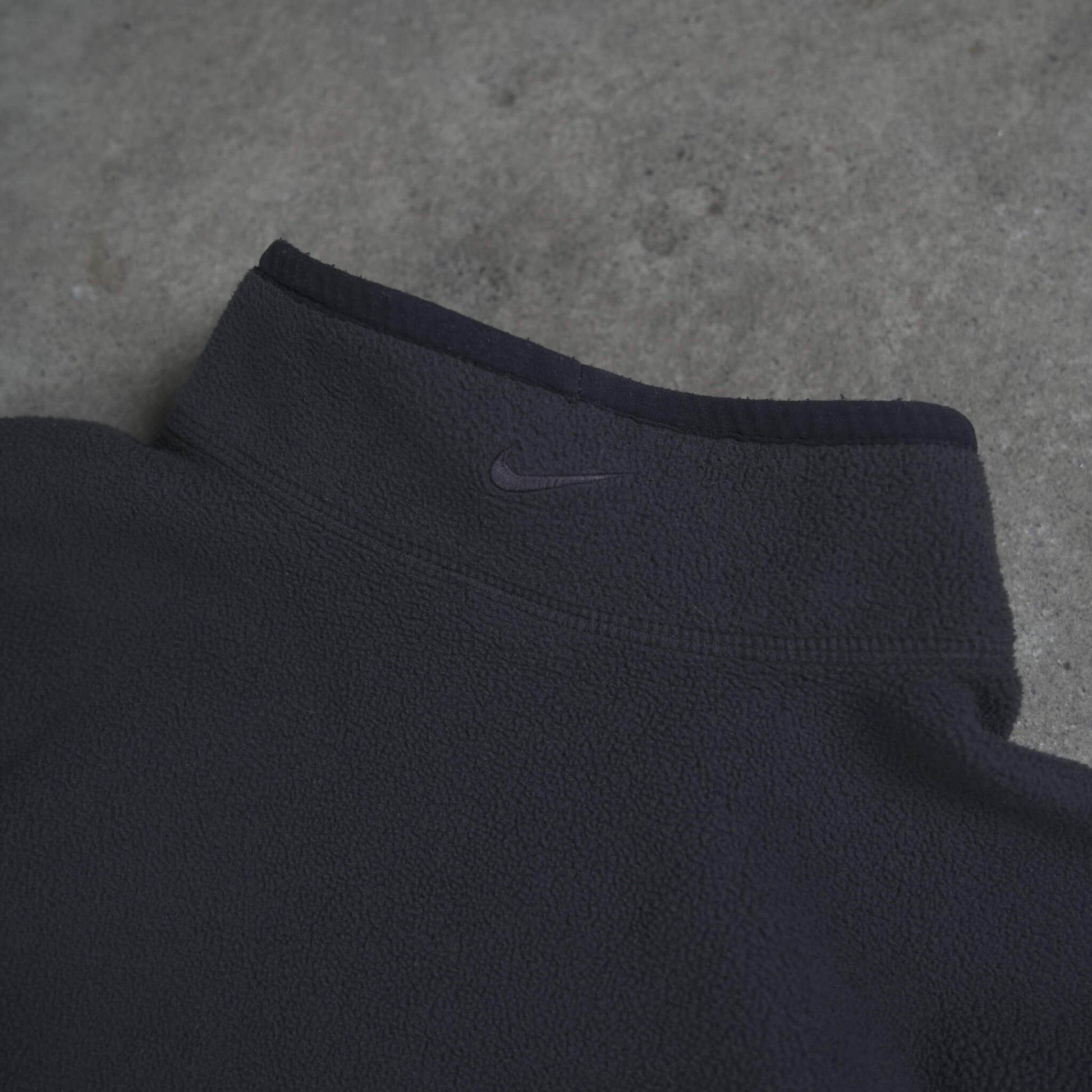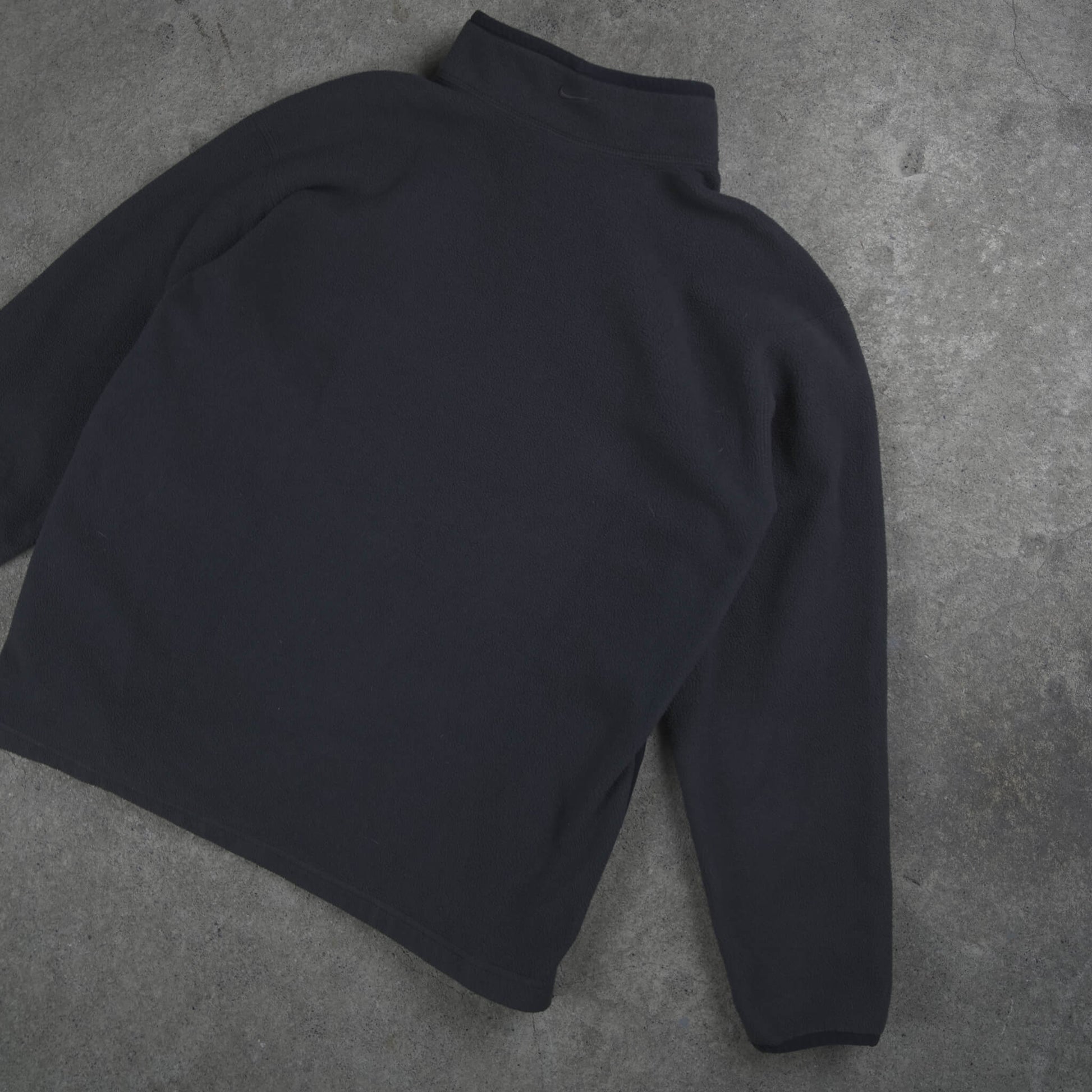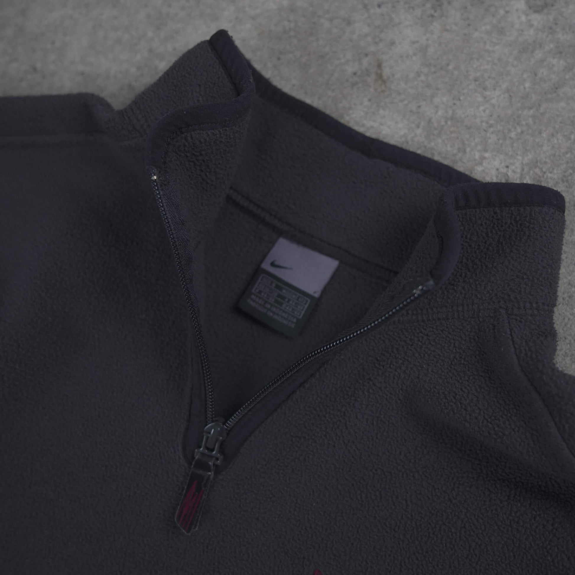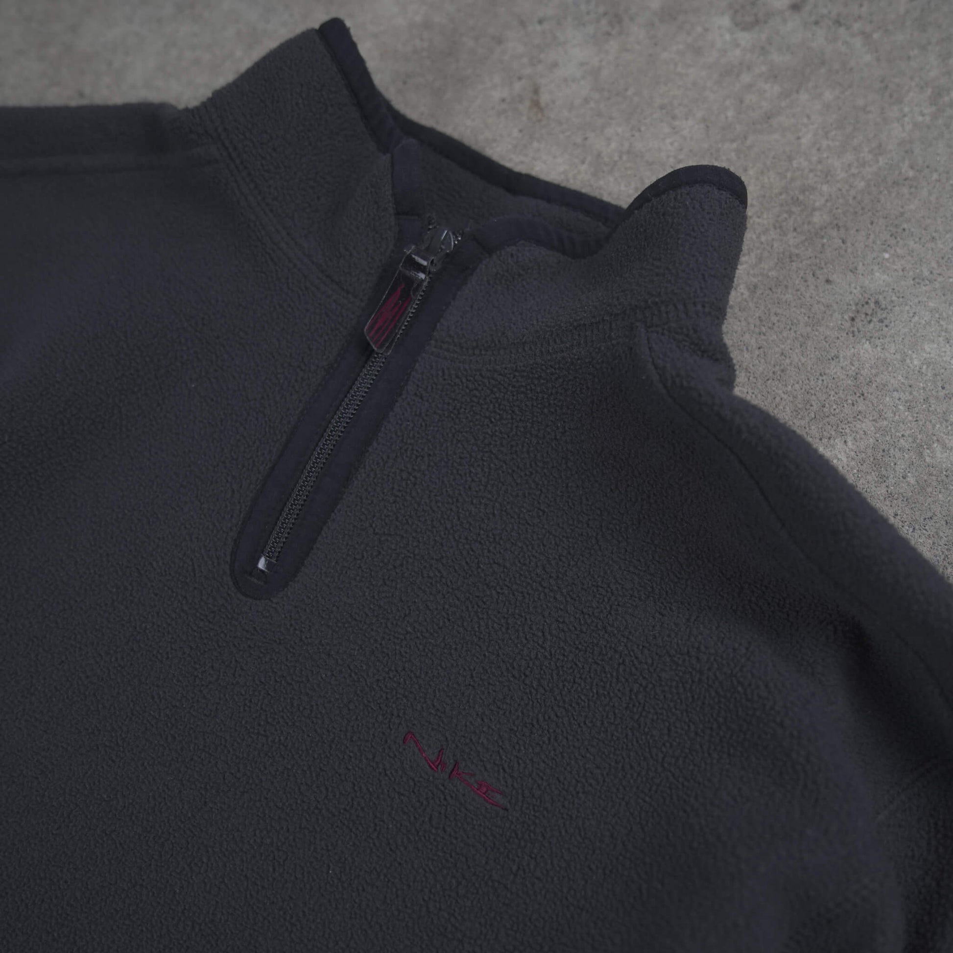 Authentic Vintage Nike 1/4 Zip Fleece Pullover from 2000. Ultra-minimalist obsidian/black design with subtle red "nike" script embroidery on the chest, high stand collar, heavy metal zipper with red pull tab, functional side-seam vent zips, and a tonal black Swoosh patch on the back neck. Heavyweight, buttery-soft polyester fleece – relaxed boxy Y2K fit with pure stealth vibes. Classic early-2000s piece in excellent condition, perfect for techwear layering or understated streetwear.