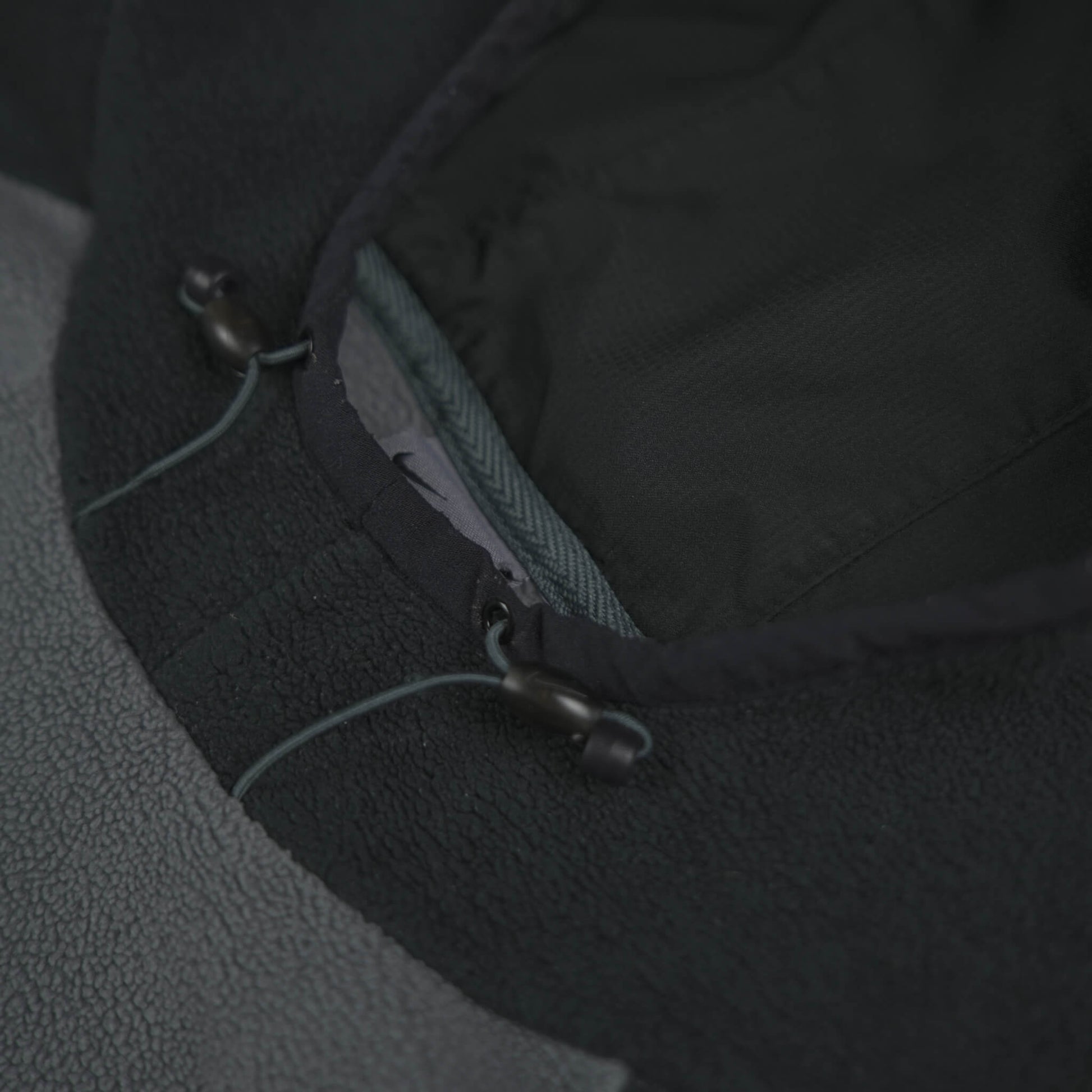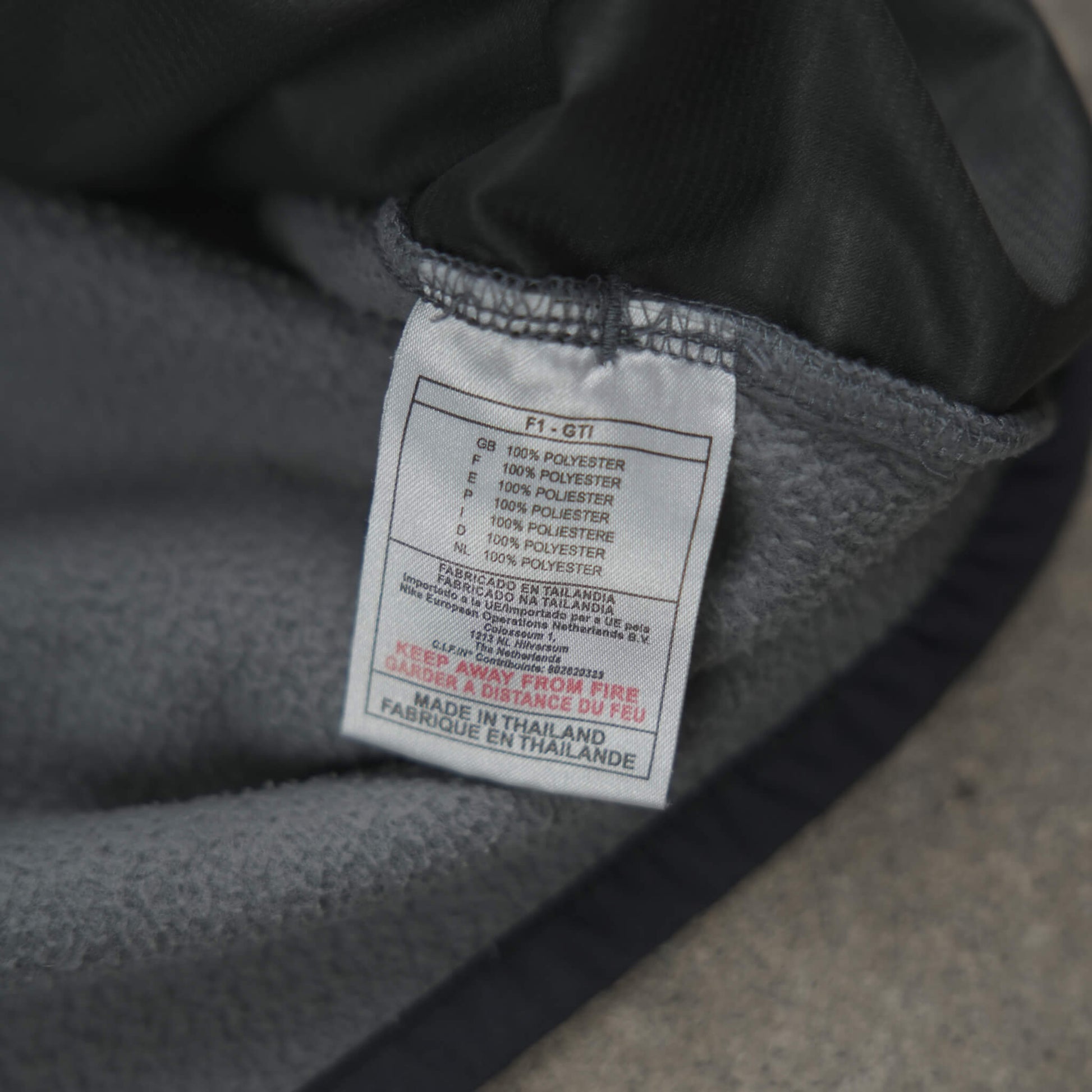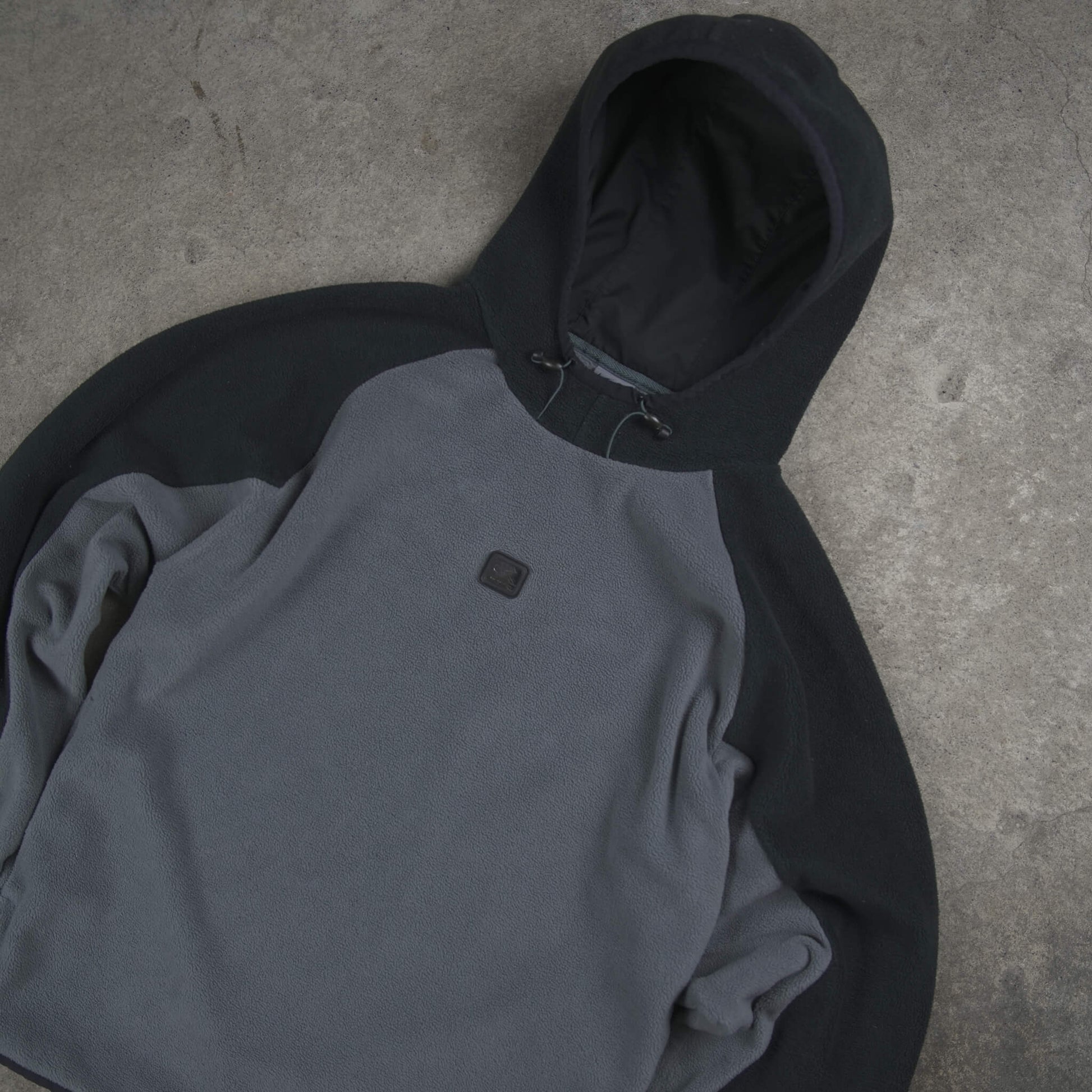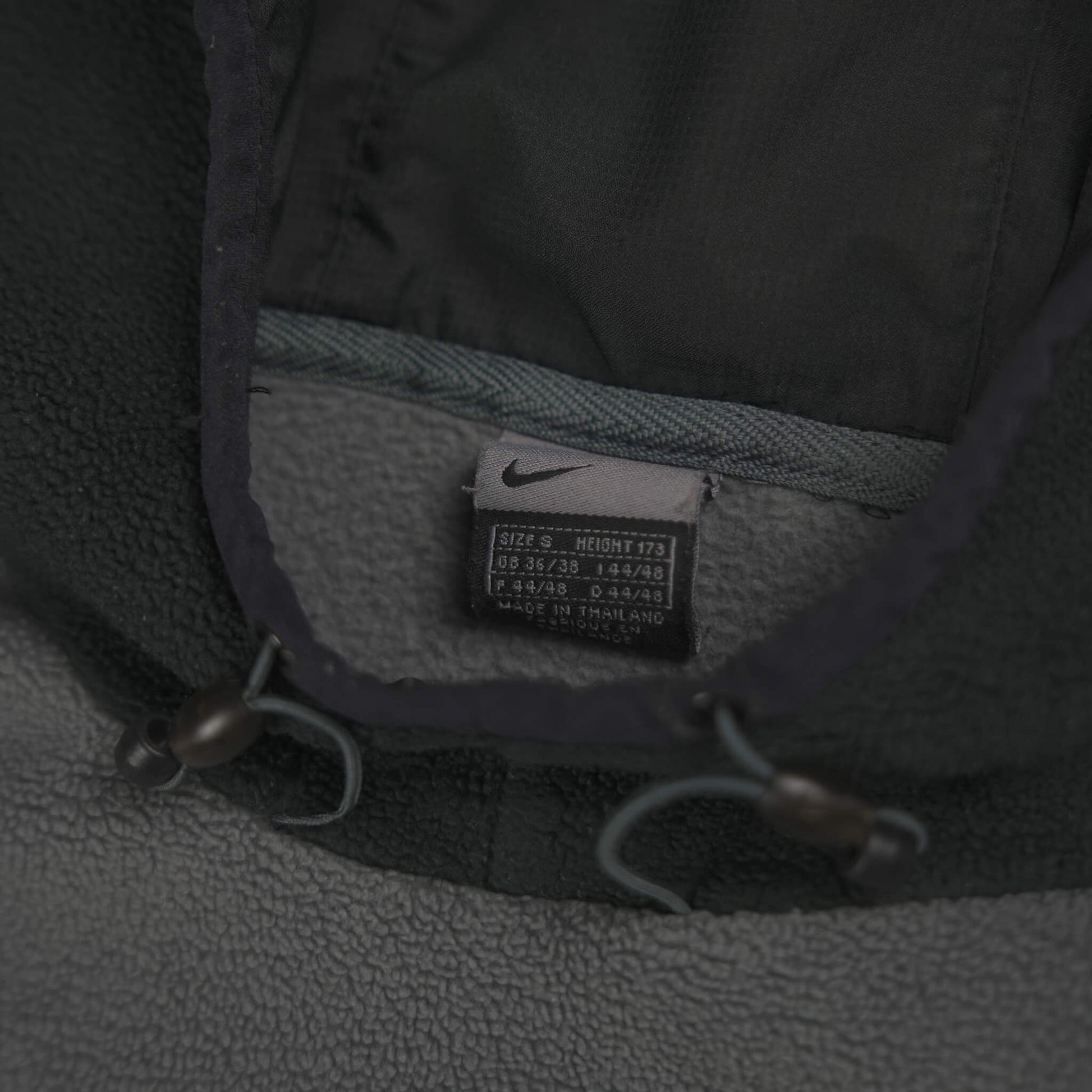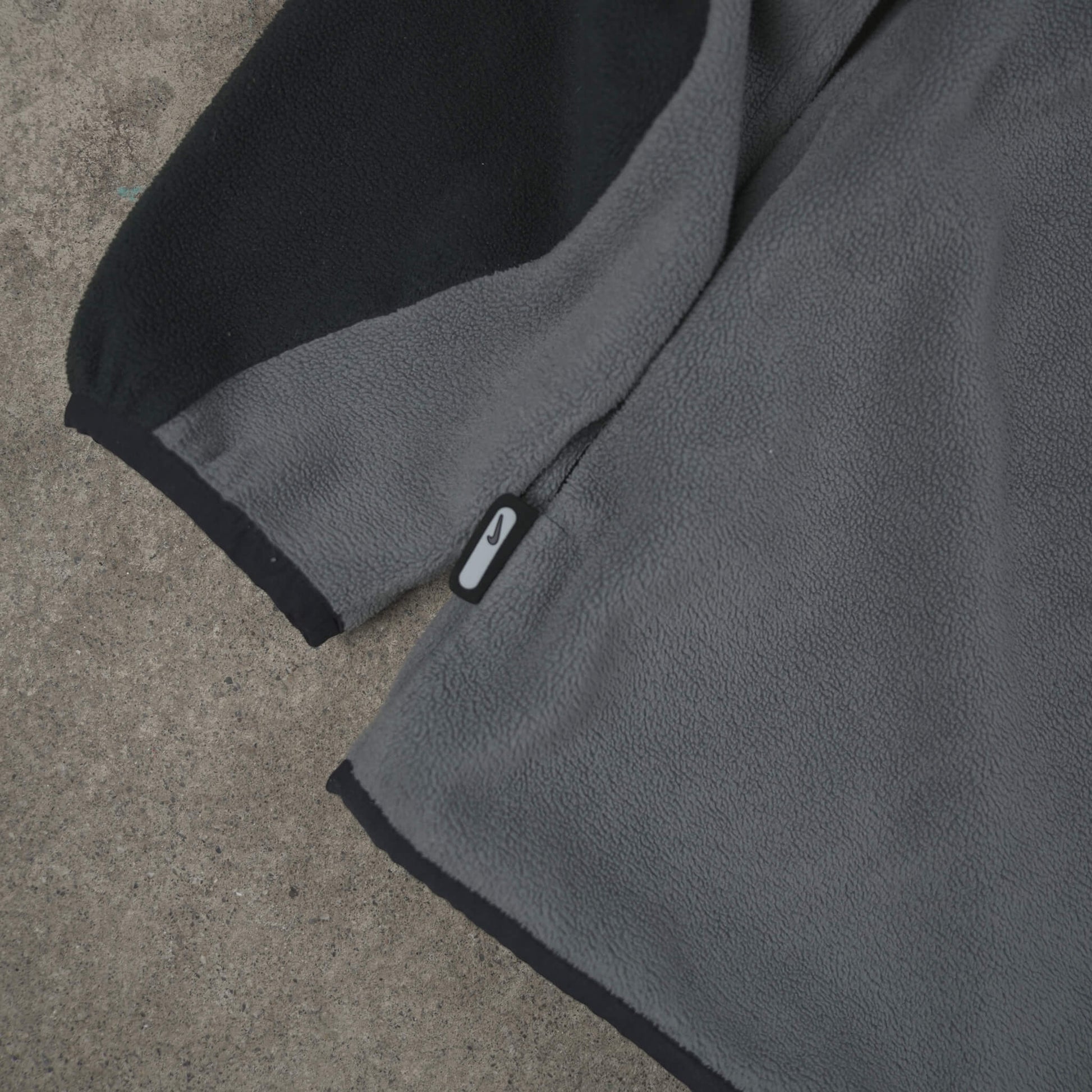 Authentic Vintage Nike Fleece Pullover from 2001. Clean two-tone grey/black colorway with subtle tonal Swoosh embroidery on the back, signature metal Nike patch on the chest, and black fleece hood/shoulders for contrast. Soft 100% polyester fleece construction – warm, lightweight, and durable with that iconic early-2000s athletic fit. Adjustable drawstring hood and kangaroo pocket. Rare Y2K-era piece in very good vintage condition, perfect for casual layering, techwear-inspired fits, or everyday comfort.