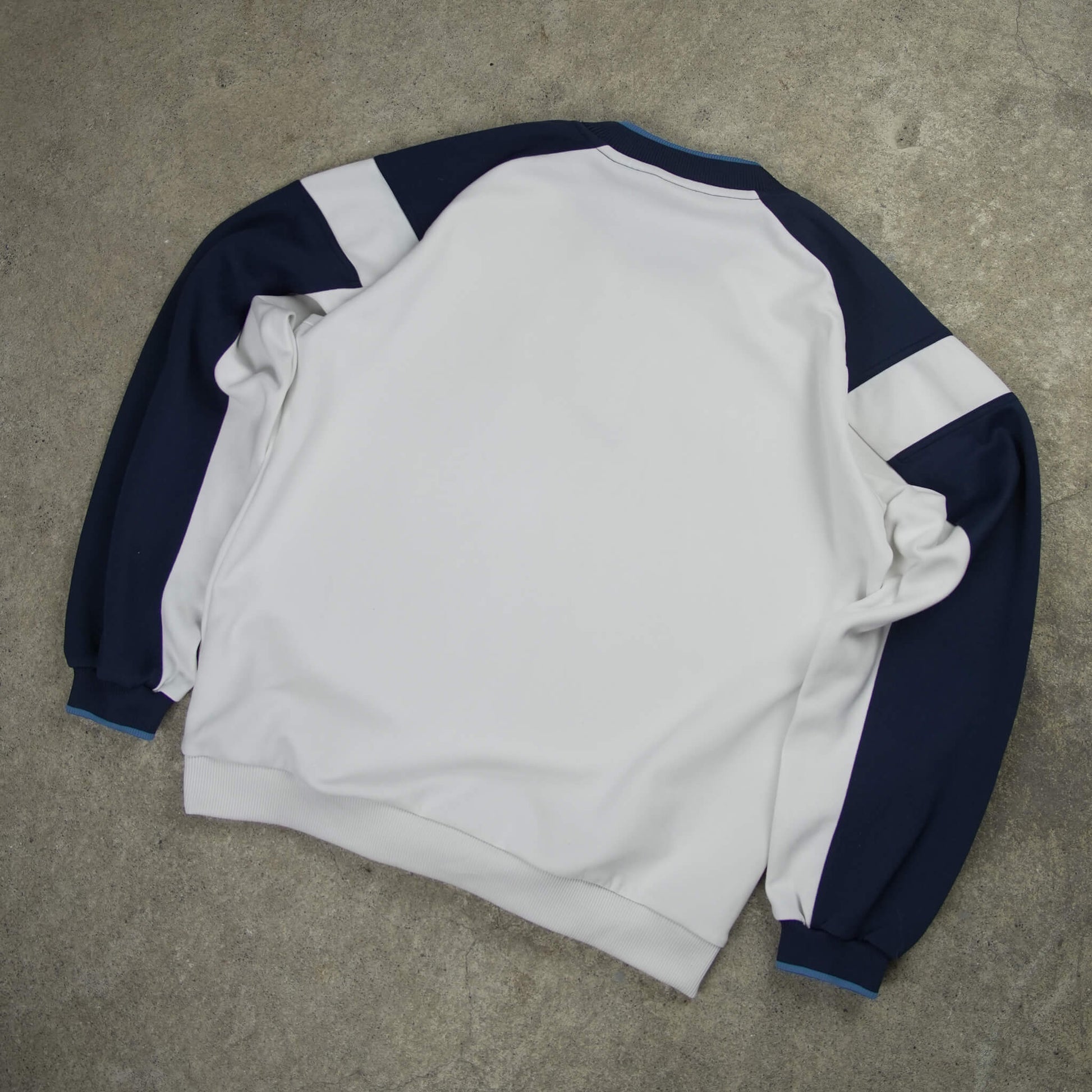 Authentic Vintage Nike Crewneck Sweatshirt from 2009. Clean white body with navy raglan sleeves and bold vertical "NIKE" embroidery in black with lime-green outline, classic late-2000s Nike graphic style with the Swoosh integrated right under the lettering for that subtle, premium detail. Soft heavyweight fleece blend (87% polyester / 13% cotton) that's durable, holds shape perfectly and feels broken-in from the start. Ribbed navy cuffs, hem and collar with light blue trim add the thoughtful contrast without overdoing it. Kids XL sizing that fits adults S-M comfortably in a relaxed, true-to-size athletic cut. One of the harder-to-find colorways from this era. A super rare piece in top vintage condition. Perfect for relaxed streetwear layering, retro sporty fits, oversized casual looks or that effortless 00s Nike flex.