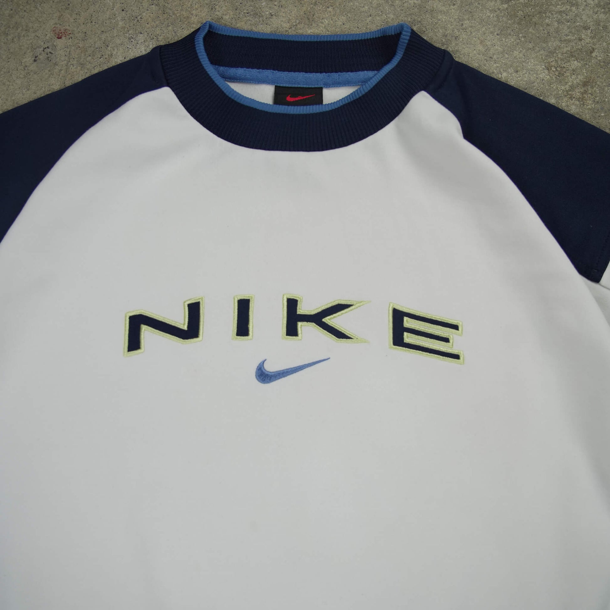 - Features: Crewneck, raglan sleeves, vertical "NIKE" embroidery with integrated Swoosh, ribbed navy cuffs/hem/collar with light blue trim