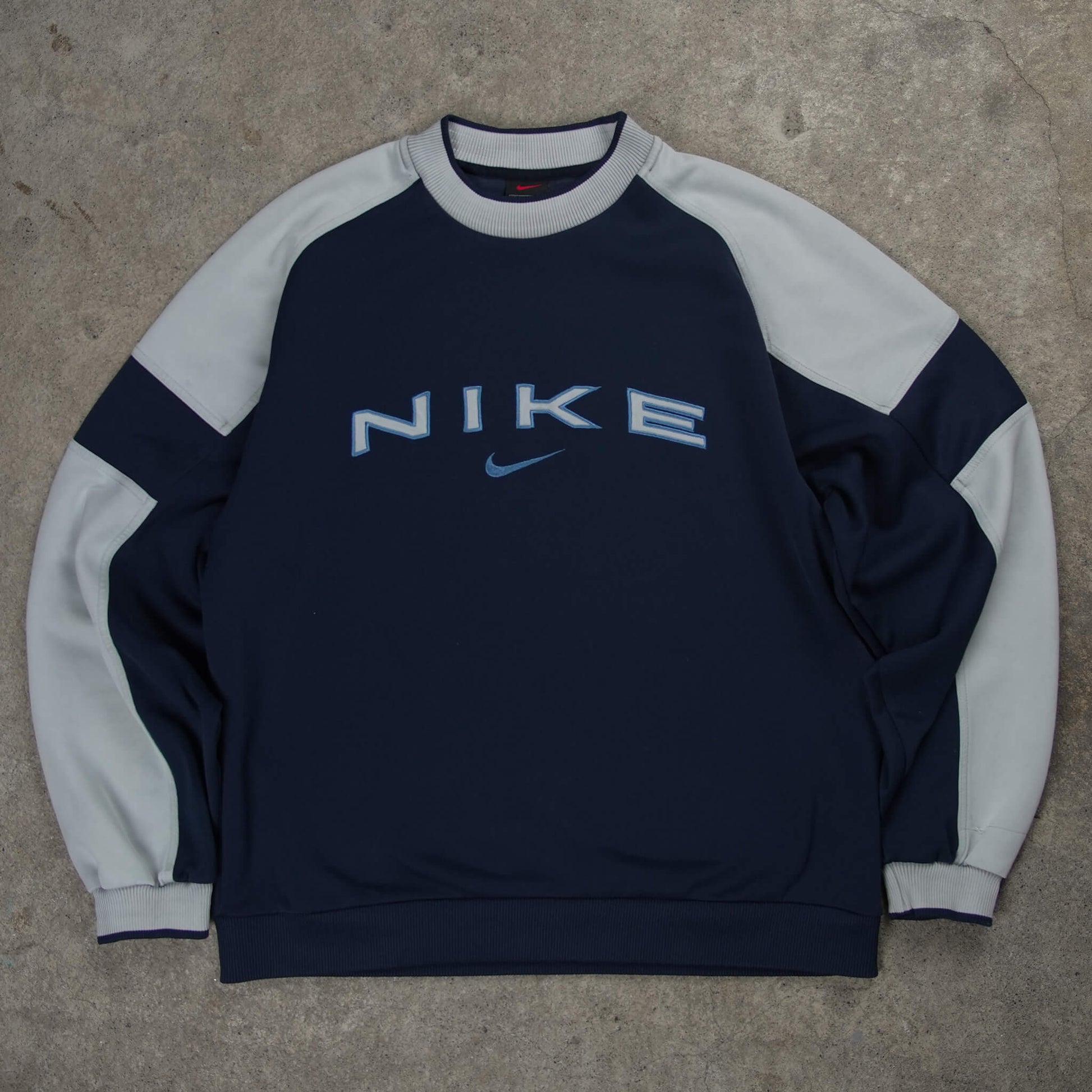 Authentic Vintage Nike Crewneck Sweater from 2009 with that clean arched "NIKE" spellout and center Swoosh embroidery. Deep navy blue body with light gray/white raglan panels on the shoulders and striped ribbing at the collar, cuffs, and hem, super subtle contrast that gives it that premium, thoughtful late-2000s vibe without screaming for attention. The arched "NIKE" across the chest is embroidered in light blue/white tones, with the matching center Swoosh stitched right in the middle for real depth and texture, not some flat print. Soft heavyweight fleece blend (13% cotton / 87% polyester) that's durable, holds its shape, and feels broken-in from day one. One of the harder-to-find colorways from this era, perfect for collectors chasing that Y2K-to-gorpcore crossover or anyone building quiet luxury street looks. Layers clean under an anorak or just rocks solo with trackpants, timeless either way.