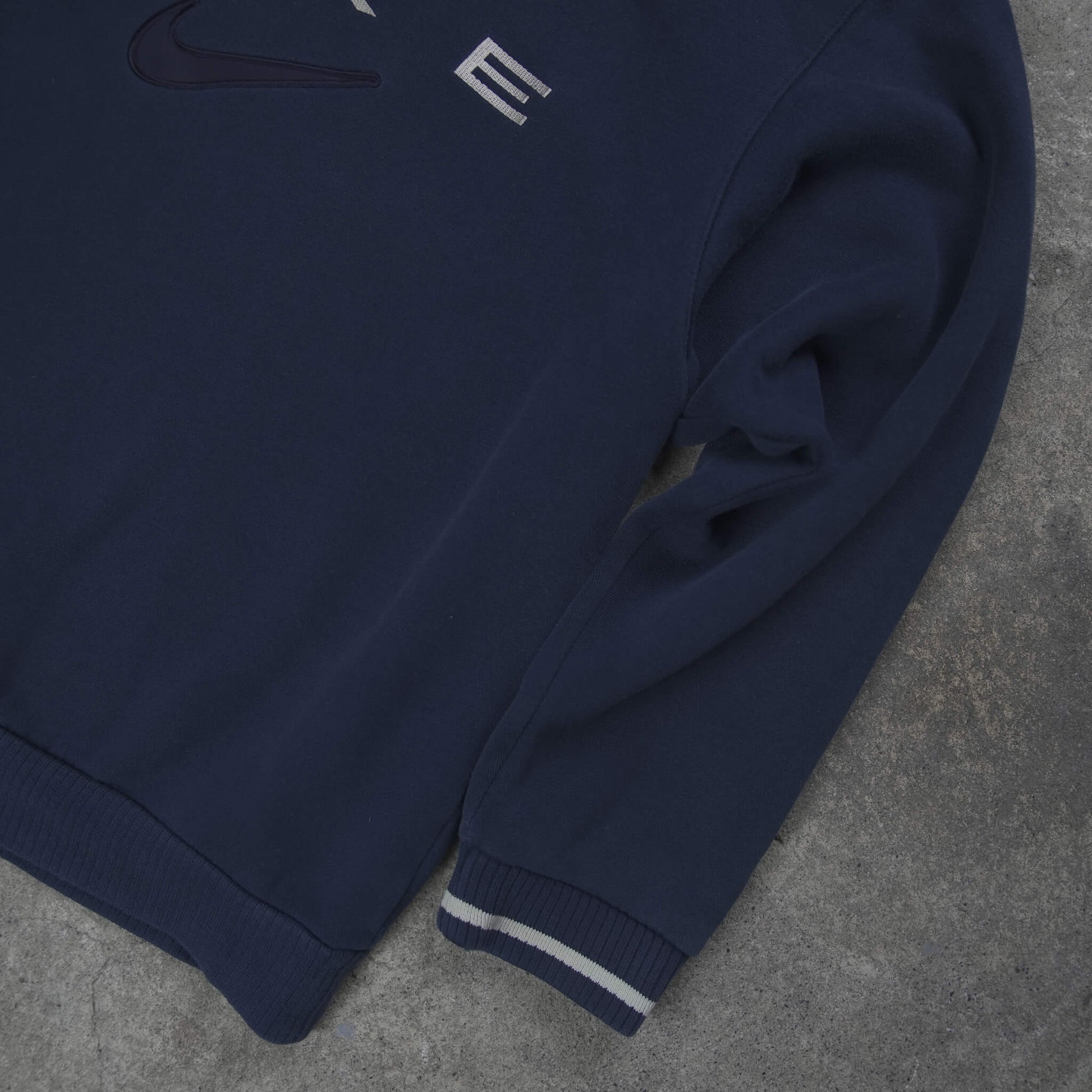 Authentic Vintage Nike Arched Spellout Center Swoosh Crewneck Sweater from 2008. Deep navy blue colorway with crisp white embroidered arched "NIKE" spellout across the chest and a raised black center Swoosh for premium texture and contrast. Subtle striped ribbing on the crewneck, cuffs, and hem adds a classic sporty touch. Crafted from thick, cozy cotton-poly fleece – built to last with that iconic late-2000s oversized fit. Essential retro Nike staple, ideal for streetwear stacks, casual vibes, or everyday comfort.