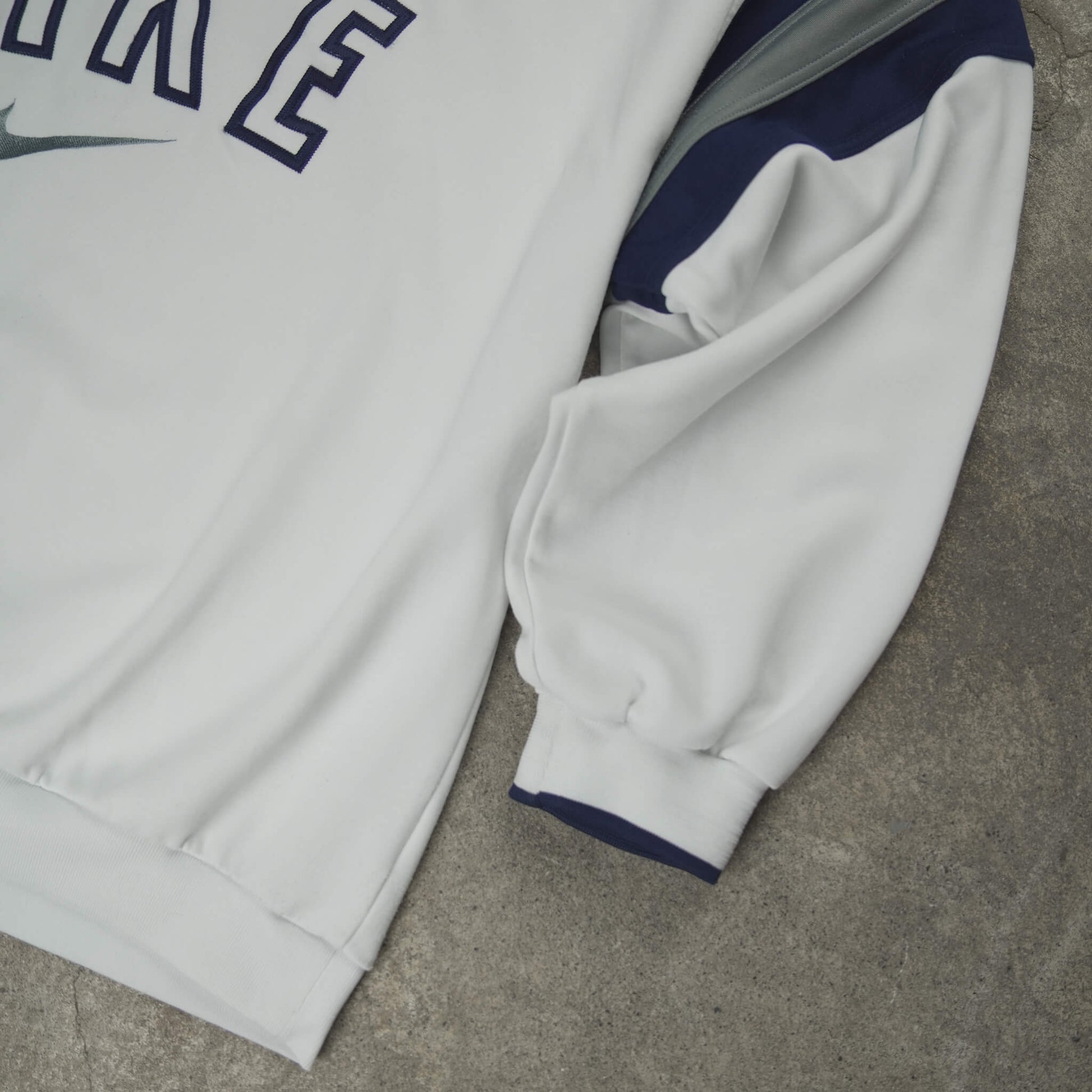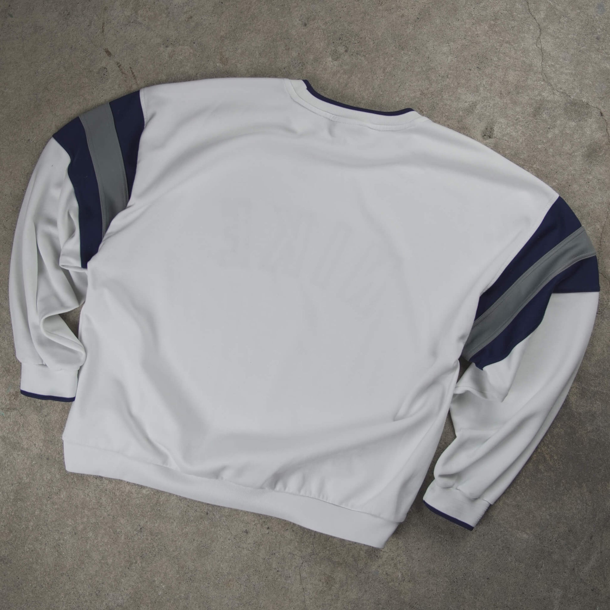 Authentic Vintage Nike Arched Spellout Center Swoosh Crewneck Sweater from 2008. Timeless white design with contrasting navy blue and gray colorblock panels on the shoulders and sleeves for a bold athletic look. Features a large embroidered arched "NIKE" spellout across the chest with a metallic gray center Swoosh underneath – clean, oversized Y2K-era branding. Ribbed crewneck, cuffs, and hem with subtle navy piping. Made from soft, heavyweight cotton-poly blend fleece for comfort and durability. A classic late-2000s Nike piece, perfect for retro streetwear and everyday layering.