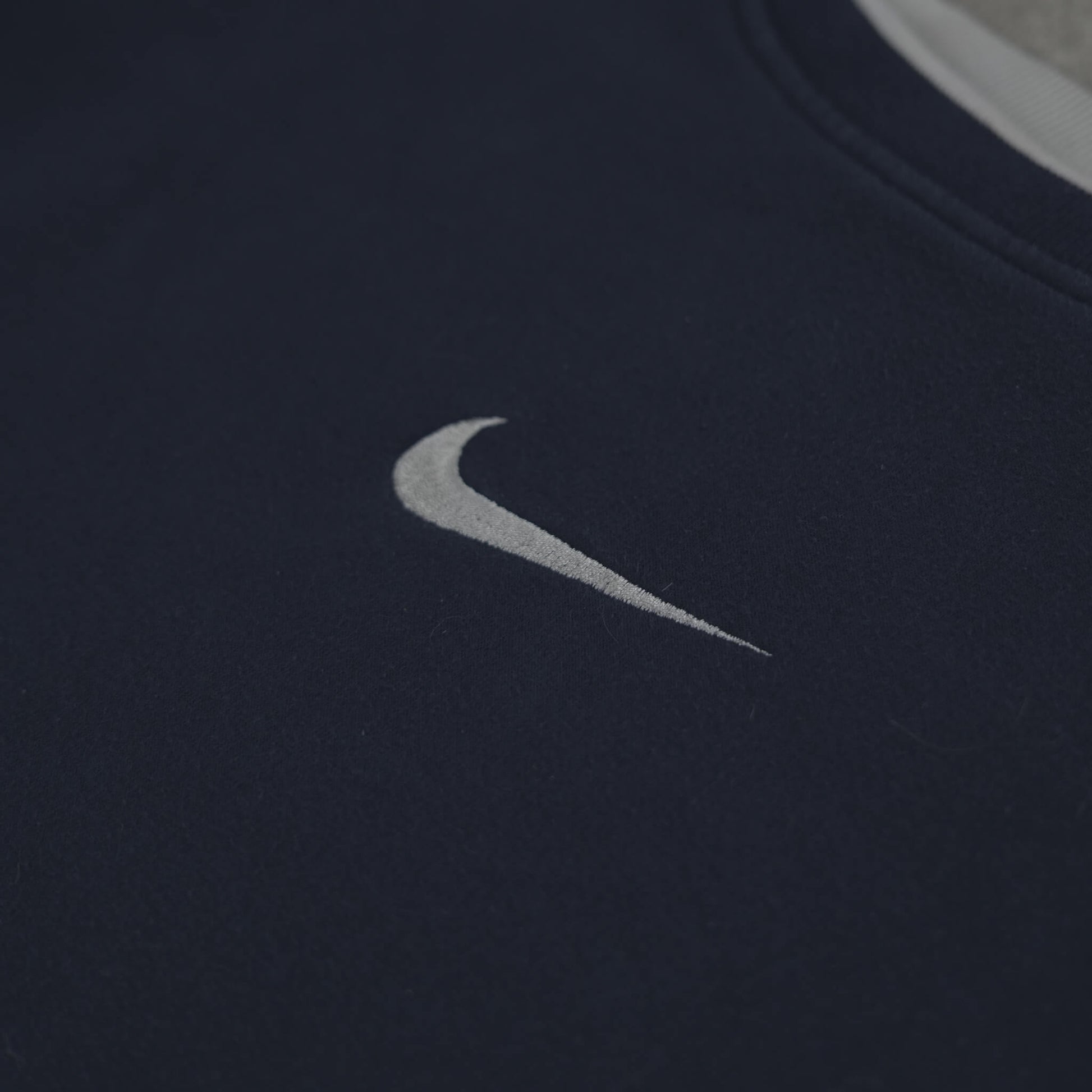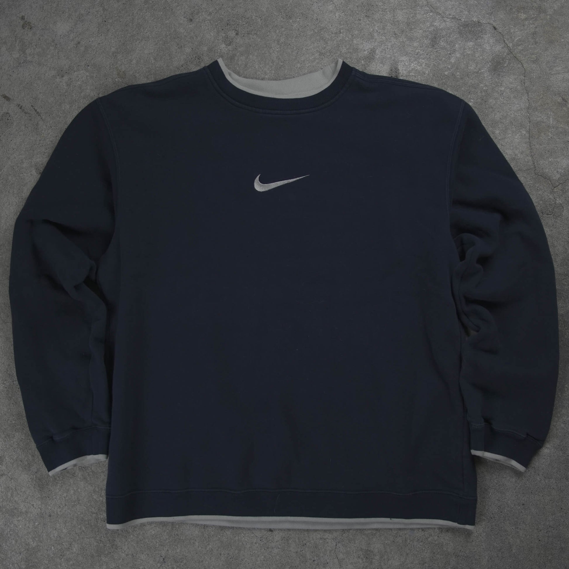 Authentic Vintage Nike Center Swoosh Crewneck Sweater from 2002. Timeless navy blue design with subtle beige contrast double-layer ribbing on collar, cuffs, and hem for that classic early-2000s layered look. Features a clean embroidered center Swoosh on the chest – no spellout, just pure minimalist Nike branding. Made from heavy, soft cotton-blend for ultimate comfort and durability. A true Y2K-era gem, perfect for retro streetwear, casual layering, and that iconic understated sportswear vibe.