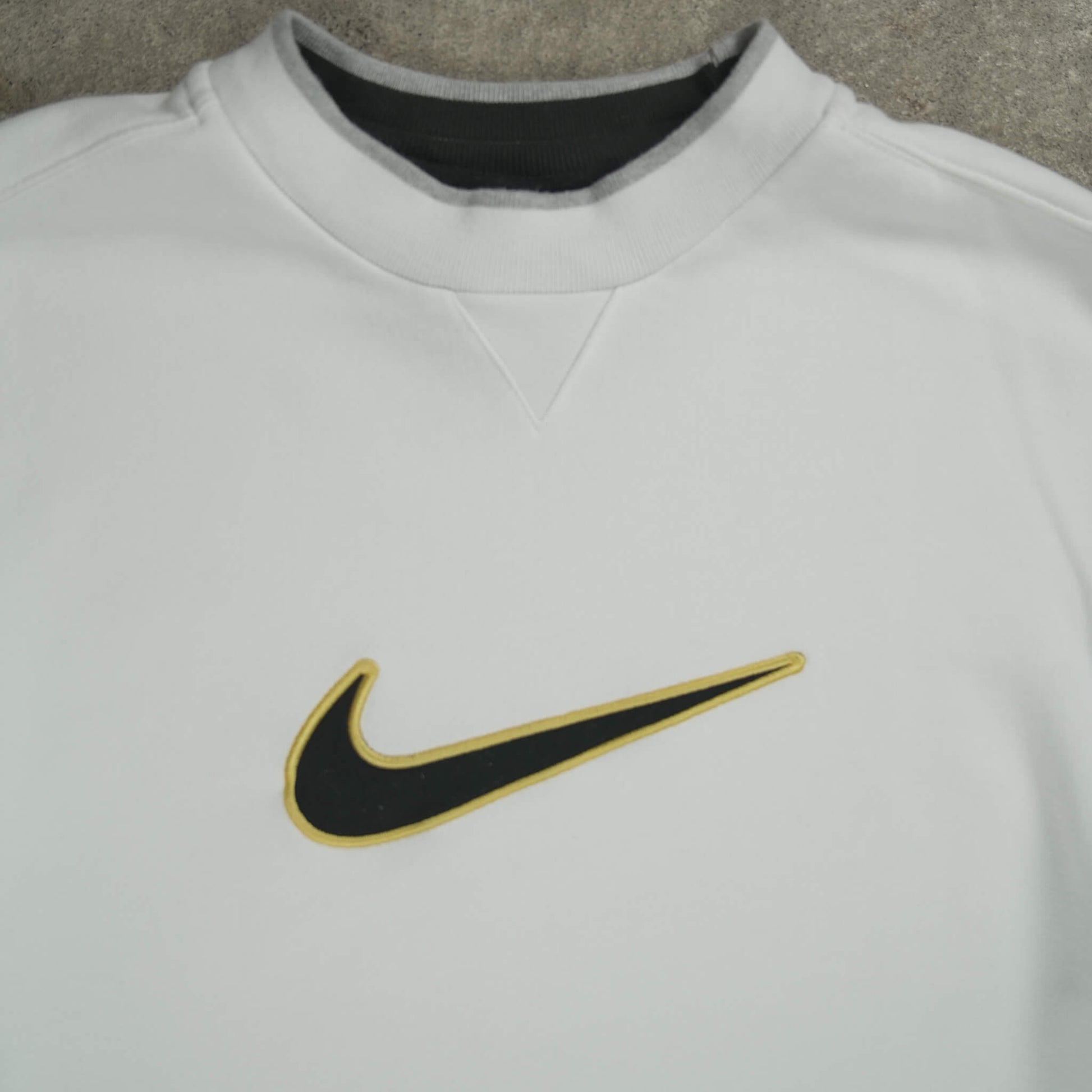 Authentic Vintage Nike Center Swoosh Crewneck Sweater from 2008. Clean white design with a large embroidered center Swoosh in black with bold gold outline – premium, standout detailing typical of late-2000s Nike lifestyle pieces. Minimalist crewneck silhouette with ribbed collar (subtle dark inner layer), cuffs, and hem for a classic athletic fit. Made from soft, heavyweight cotton-poly blend fleece for comfort and durability. A rare Y2K-era gem with that luxurious gold-trimmed Swoosh vibe, perfect for retro streetwear and casual looks.