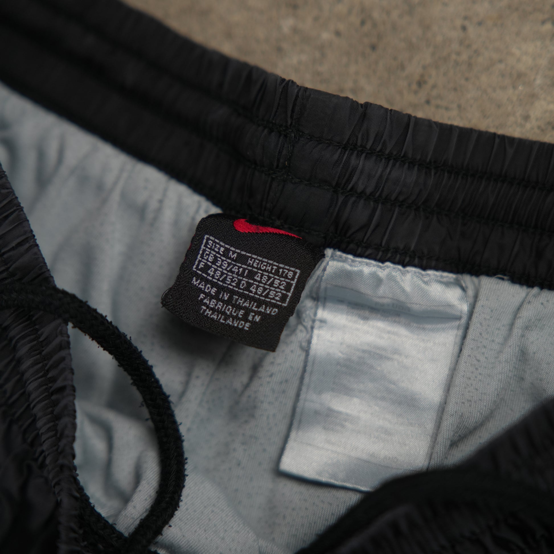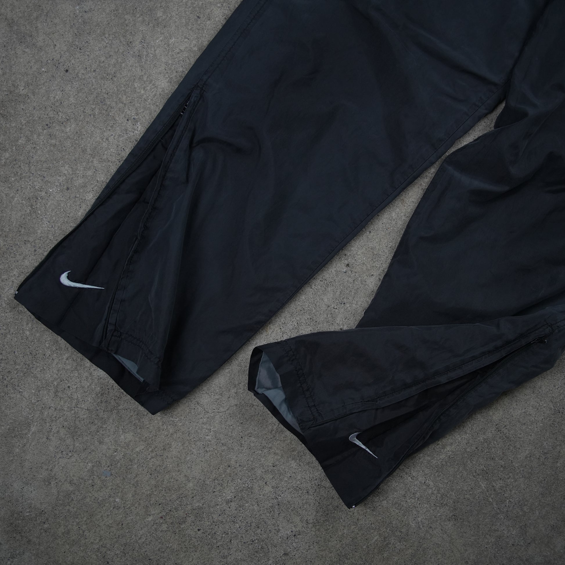 Authentic Vintage Nike Trackpants Black from 2000. Classic early-2000s black nylon trackpants with that timeless baggy fit – lightweight, wind-resistant fabric that's durable and perfect for movement or layering. High-rise elastic waist with drawcords for custom cinch, two zippered side hand pockets, full zippered leg openings that open completely at the bottom (with subtle Swoosh detail inside the zips for that hidden Nike touch), and a zippered back right pocket for secure storage. Clean design with no loud prints – just functional early-2000s Nike athletic energy. Rare piece from the turn-of-the-millennium era in excellent vintage condition – no rips, no stains, no fading – still crisp, soft and ready to wear. Perfect for retro street fits, techwear layering, oversized casual looks or that effortless Y2K Nike flex.